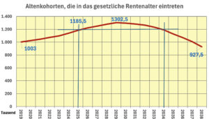 Wie bereits erwähnt gehen die „Babyboomer“ schon seit sechs Jahre in Rente und nicht wie immer behauptet „bald“ oder „demnächst“. Die Zunahme der geburtenstarken Jahrgänge erreicht in vier Jahren (2029) ihren Höhepunkt und danach sinkt die Zahl schnell wieder ab und hat in den folgenden acht Jahren (bis 2037) den Stand von 2019 erreicht. Es ist „müßig“ über diese realen Zahlen zu reden? Die Fakten zeigen, das „Problem“ ist temporär und durchaus im Rahmen der Umlagefinanzierung beherrschbar. Das wird seit etlichen Jahren von der Deutschen Rentenversicherung erklärt und mit sehr validen Daten belegt (*).